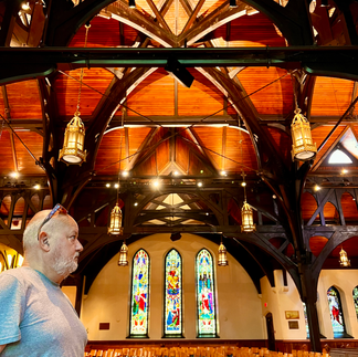 Repare na combinação belíssima da decoração em madeira com vitrais coloridos!